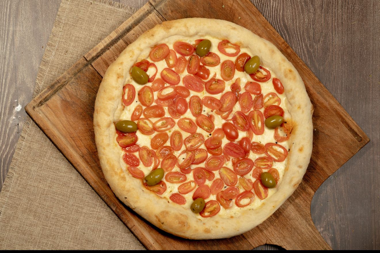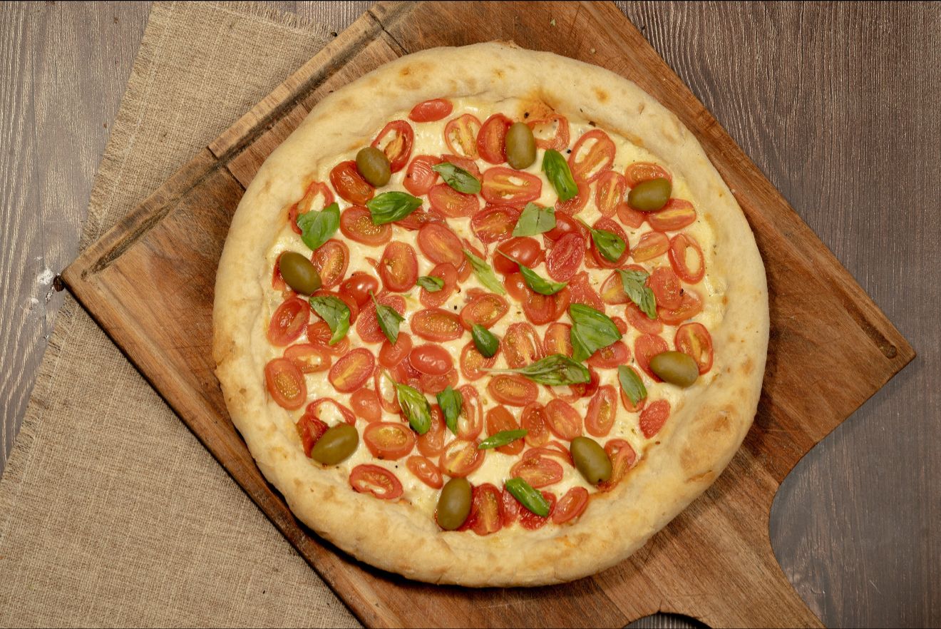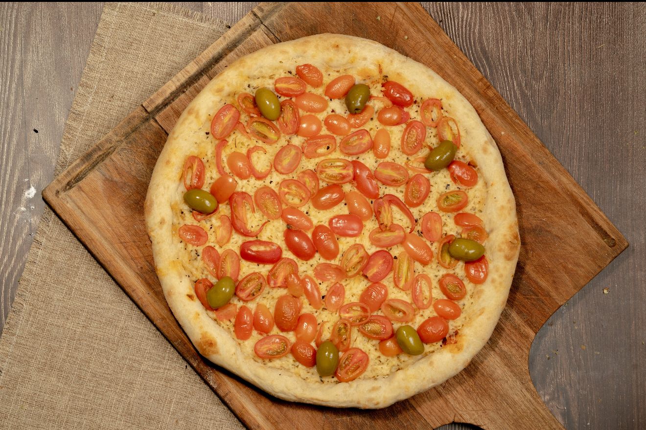 Salsa, muzzarella, tomates cherry, aceite de oliva, ajo, orégano y aceitunas verdes.