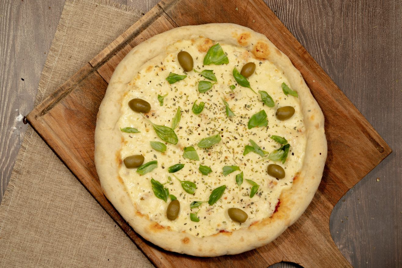 salsa, muzzarella, albahaca, aceite de oliva, orégano y aceitunas verdes