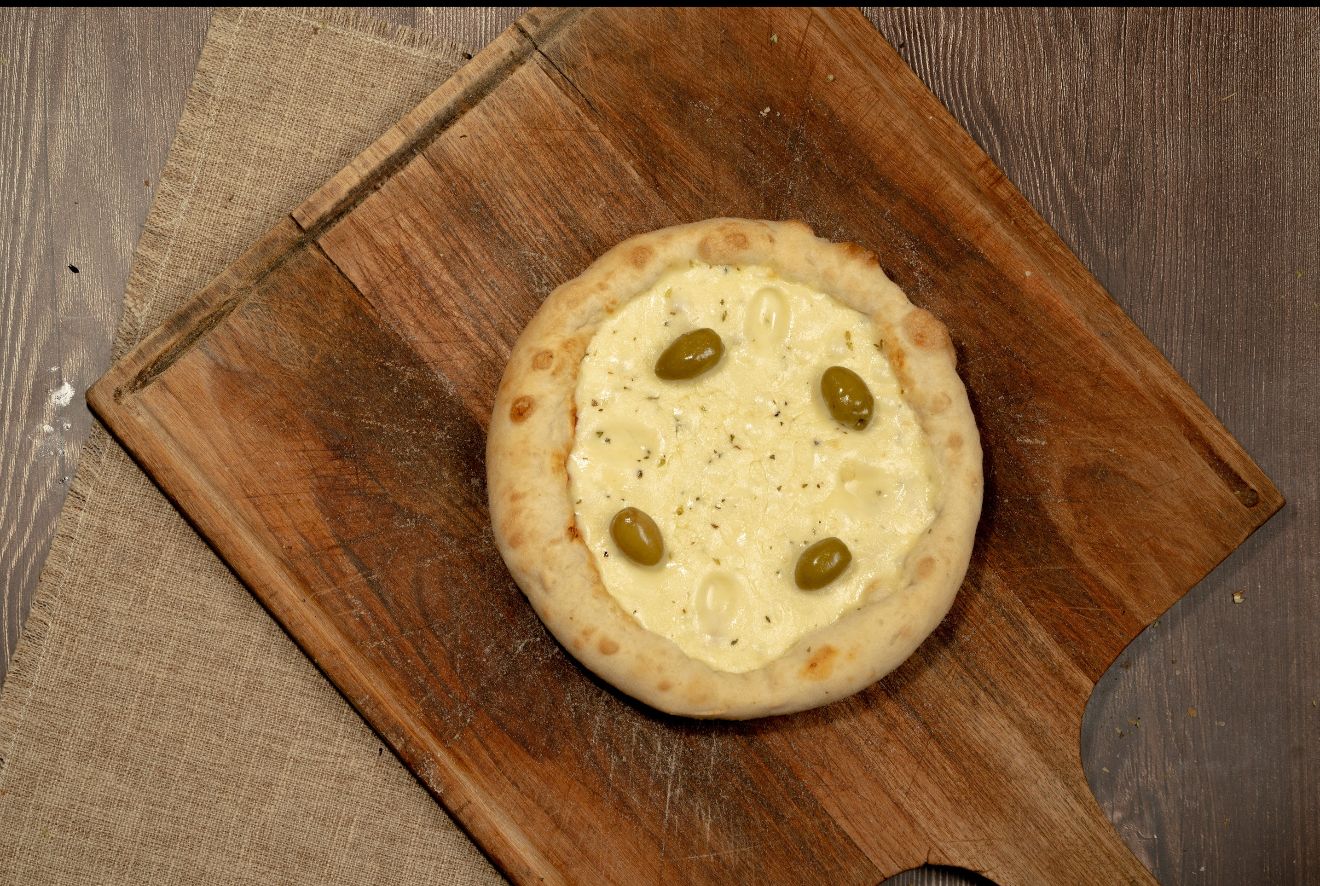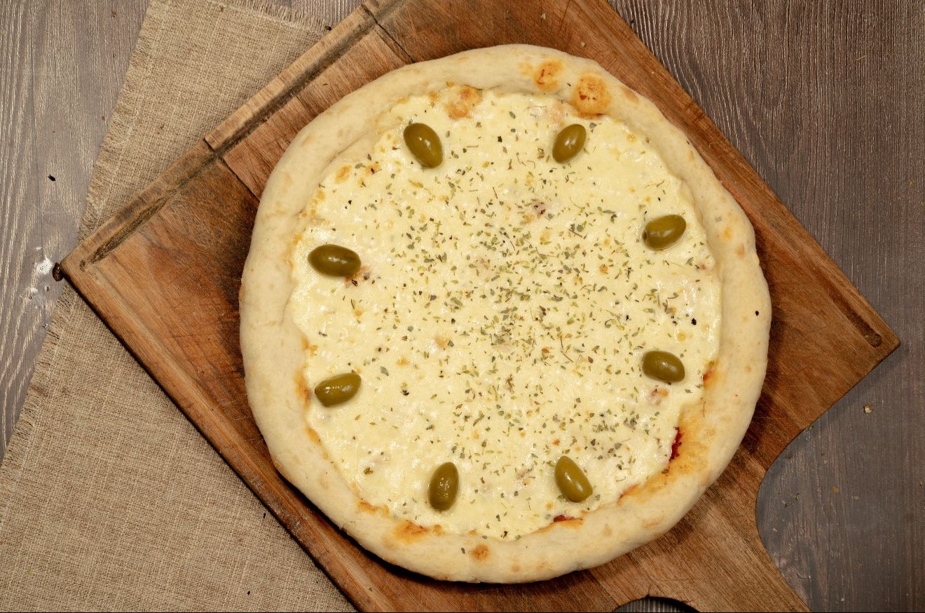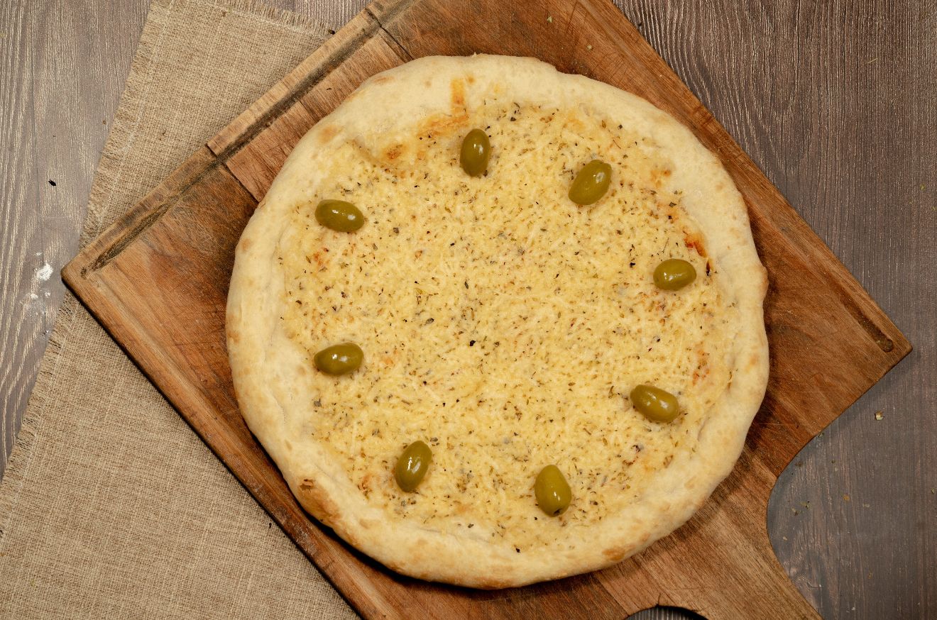 Salsa, muzzarella, orégano y aceitunas verdes.