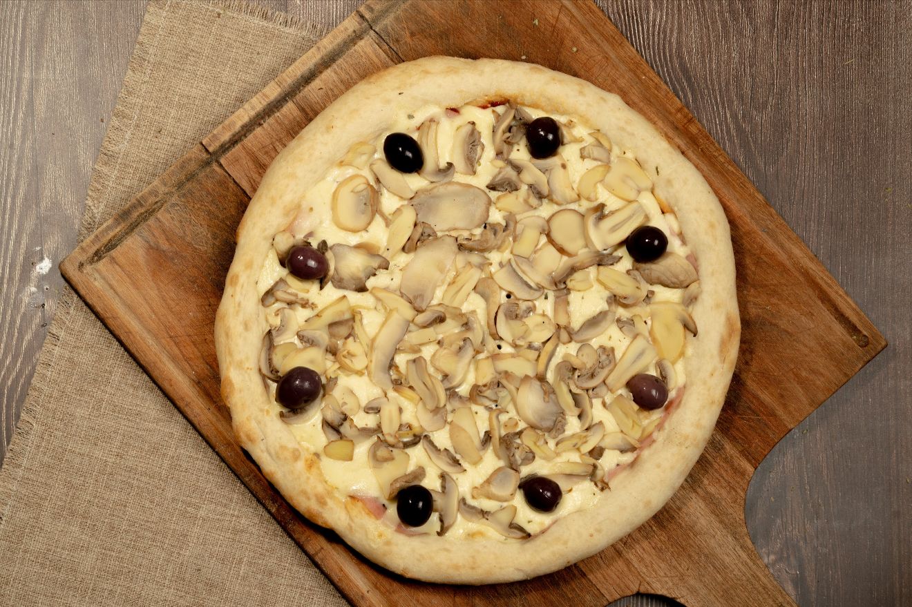 salsa, muzzarella, jamón, champignones, orégano y aceitunas negras