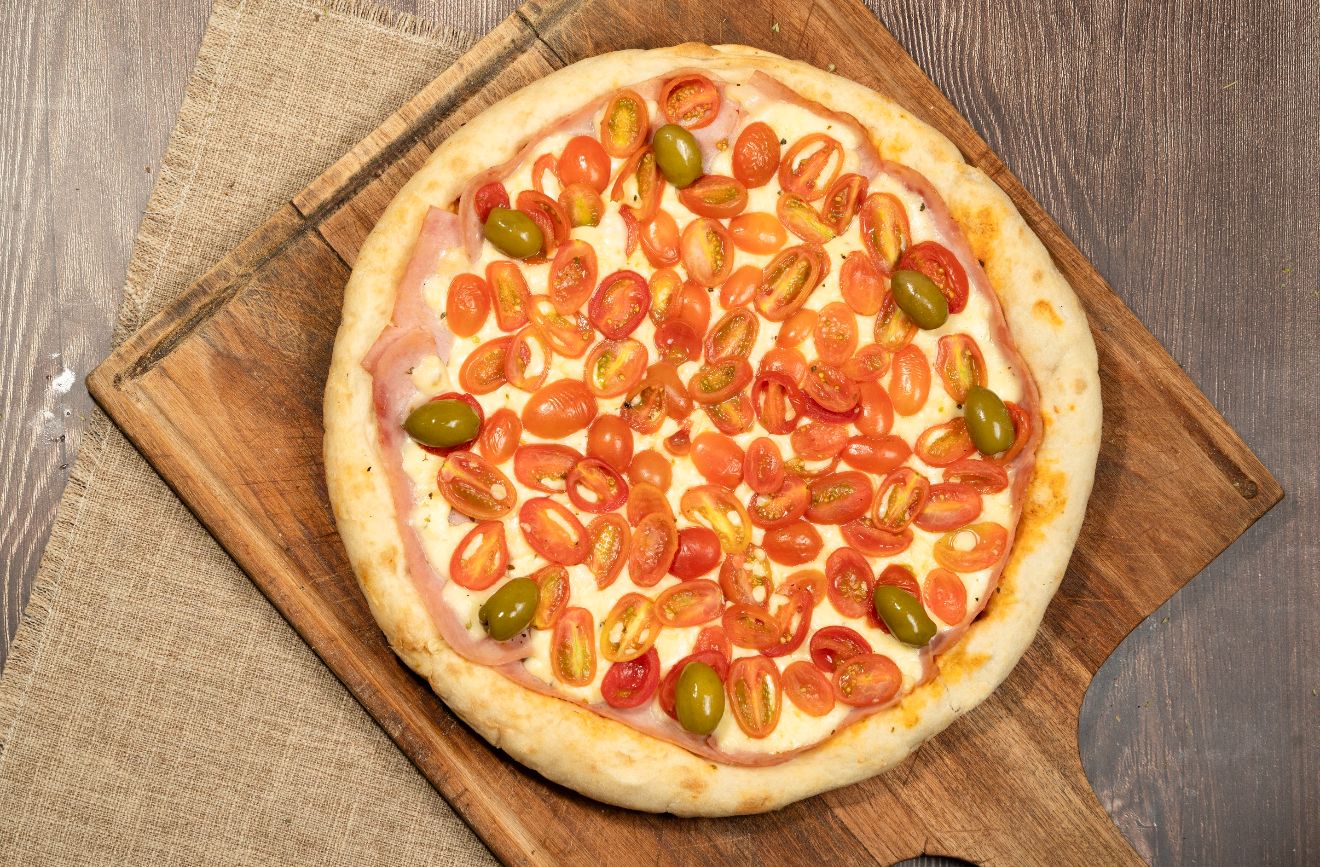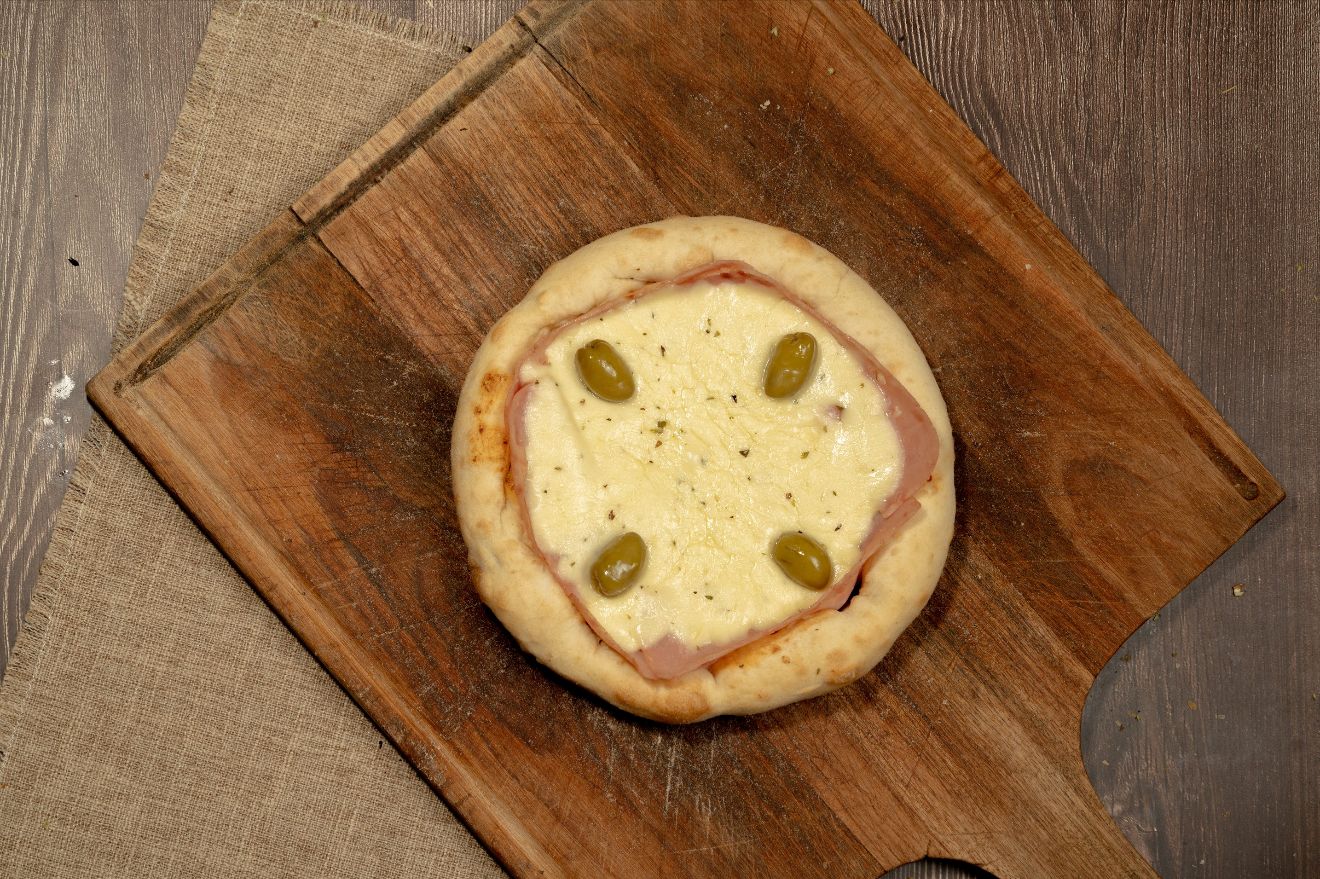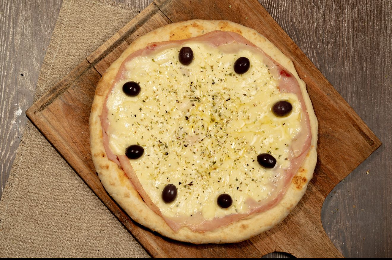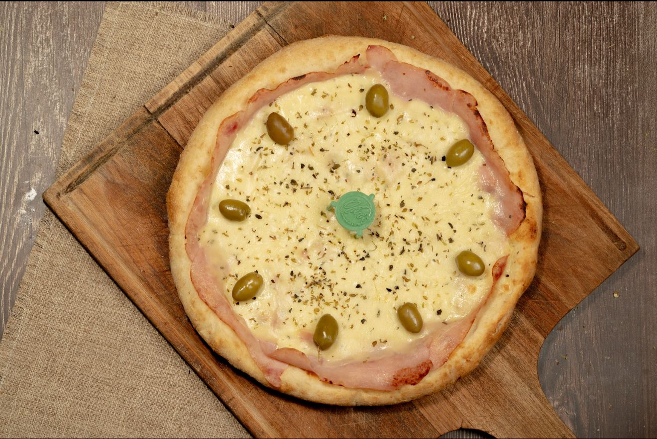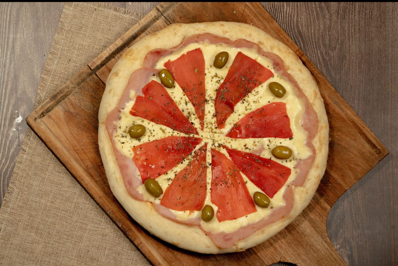 Salsa, muzzarella, jamón, morrones, orégano y aceitunas verdes.