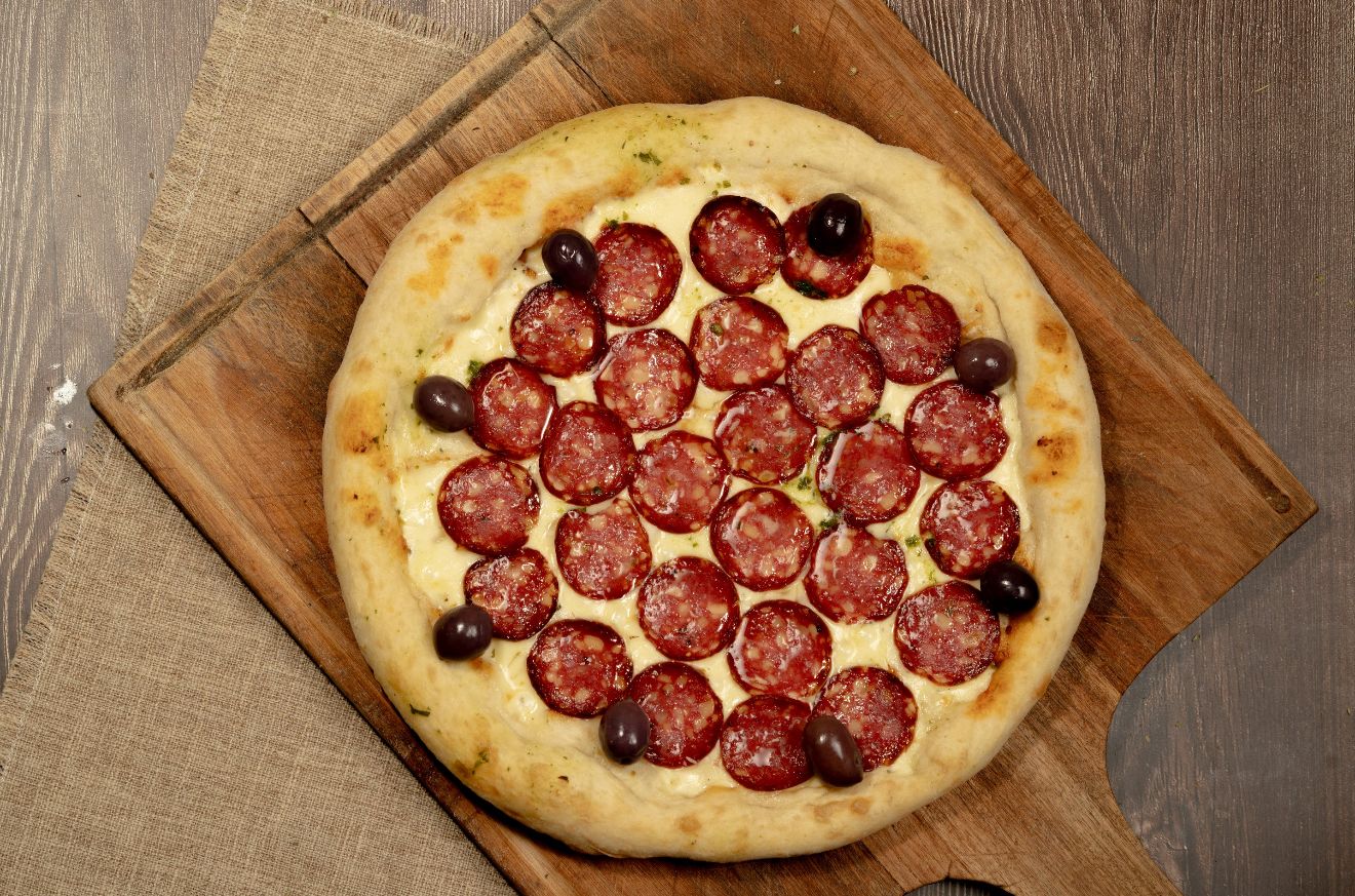 salsa, muzzarella, pepperoni, orégano y aceitunas negras