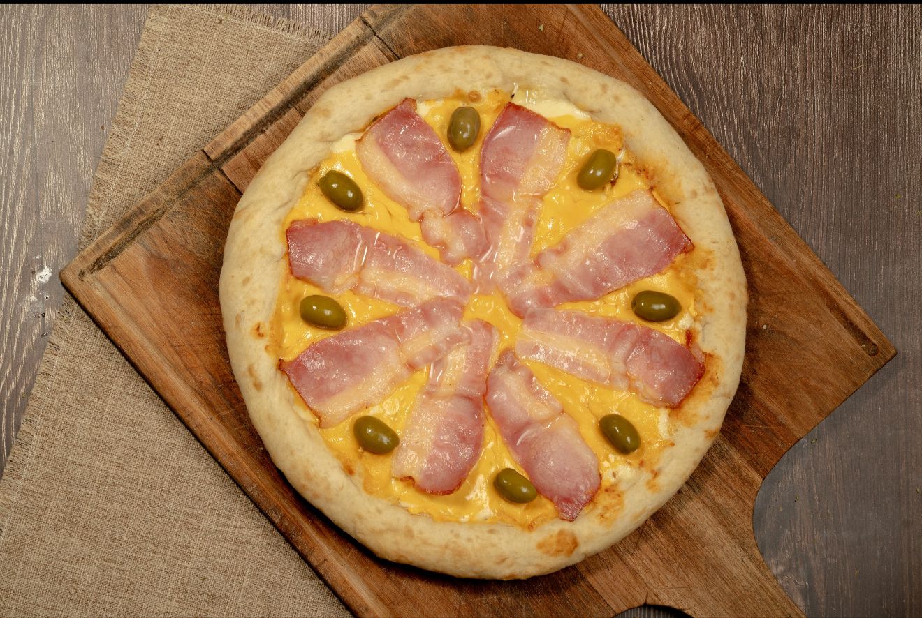 salsa, muzzarella, panceta, cheddar y aceitunas verdes