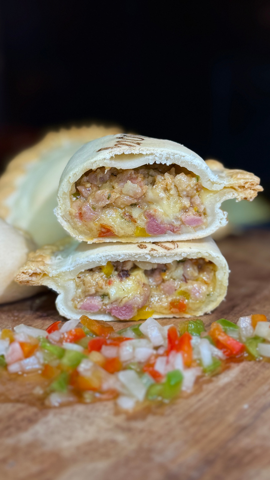 Carne picada, cebolla, huevo, morrón rojo y verdeo.