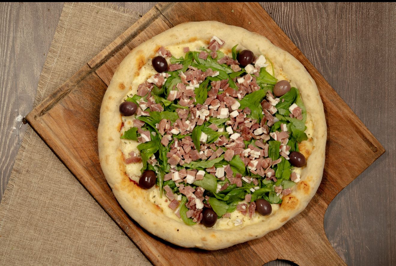 salsa, muzzarella, jamón crudo, rúcula, orégano y aceitunas negras